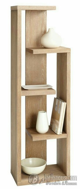 Untuk bagian depannya, tampak ada beberapa tempat menaruh barang-barang hias untuk memperindah rumah yang masing-masing tempat tersebut hanya terhubung pada satu sisi. Sedangkan bagian atasnya, pembatas kanan hanya sampai pada barisan kecil yang terakhir. Warna rak ini cukup terang dan cocok untuk benda-benda dengan warna putih atau sejenisnya.